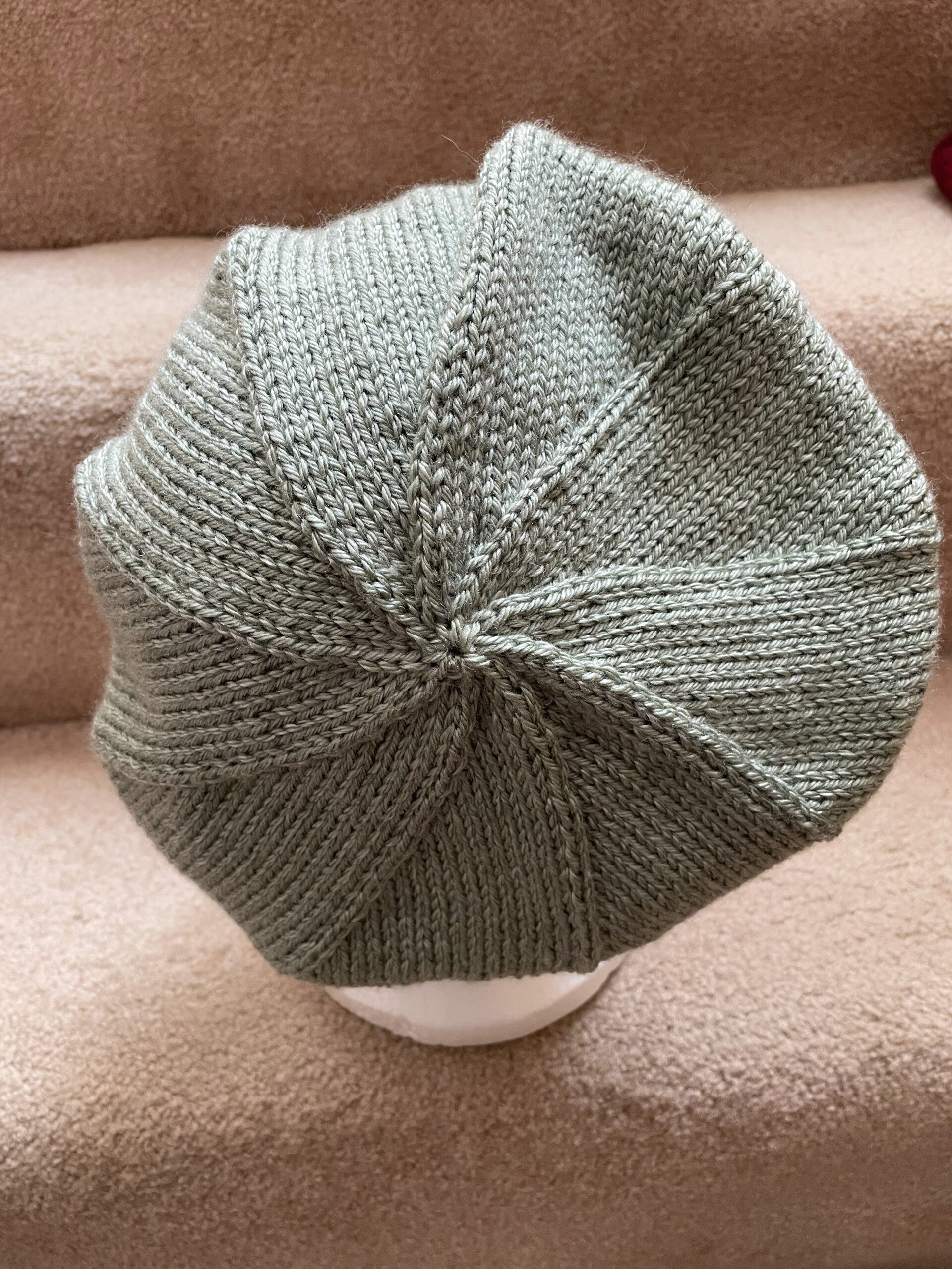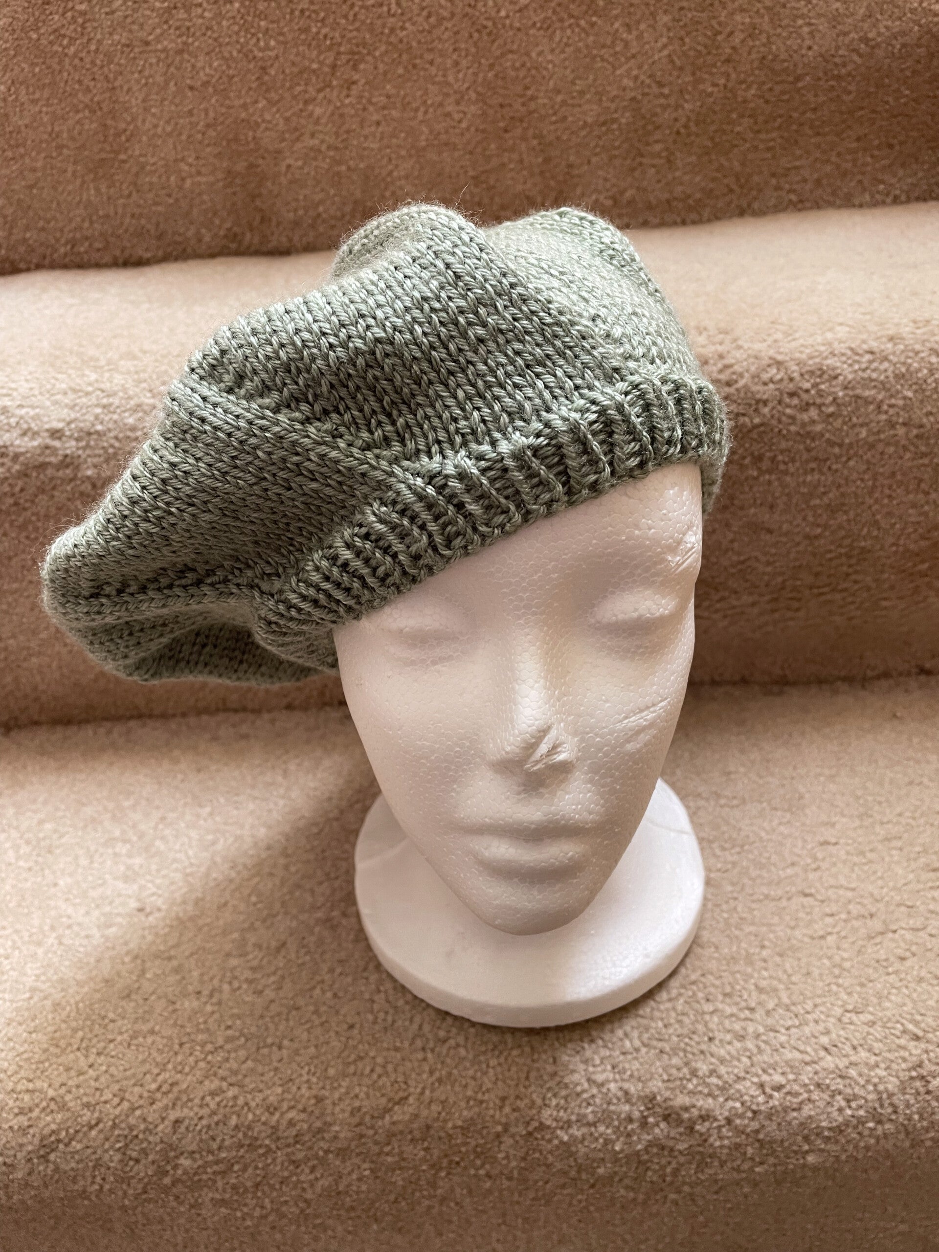 This is a French inspired beret hat. It is made from 100% acrylic yarn rather than wool. It is machine wash warm and tumble dry low. The circumference of the brim is 19 inches and will stretch to fit. The height of the hat is 8.5 inches, but is generally worn flat. This hat has some extra room for hair if needed.