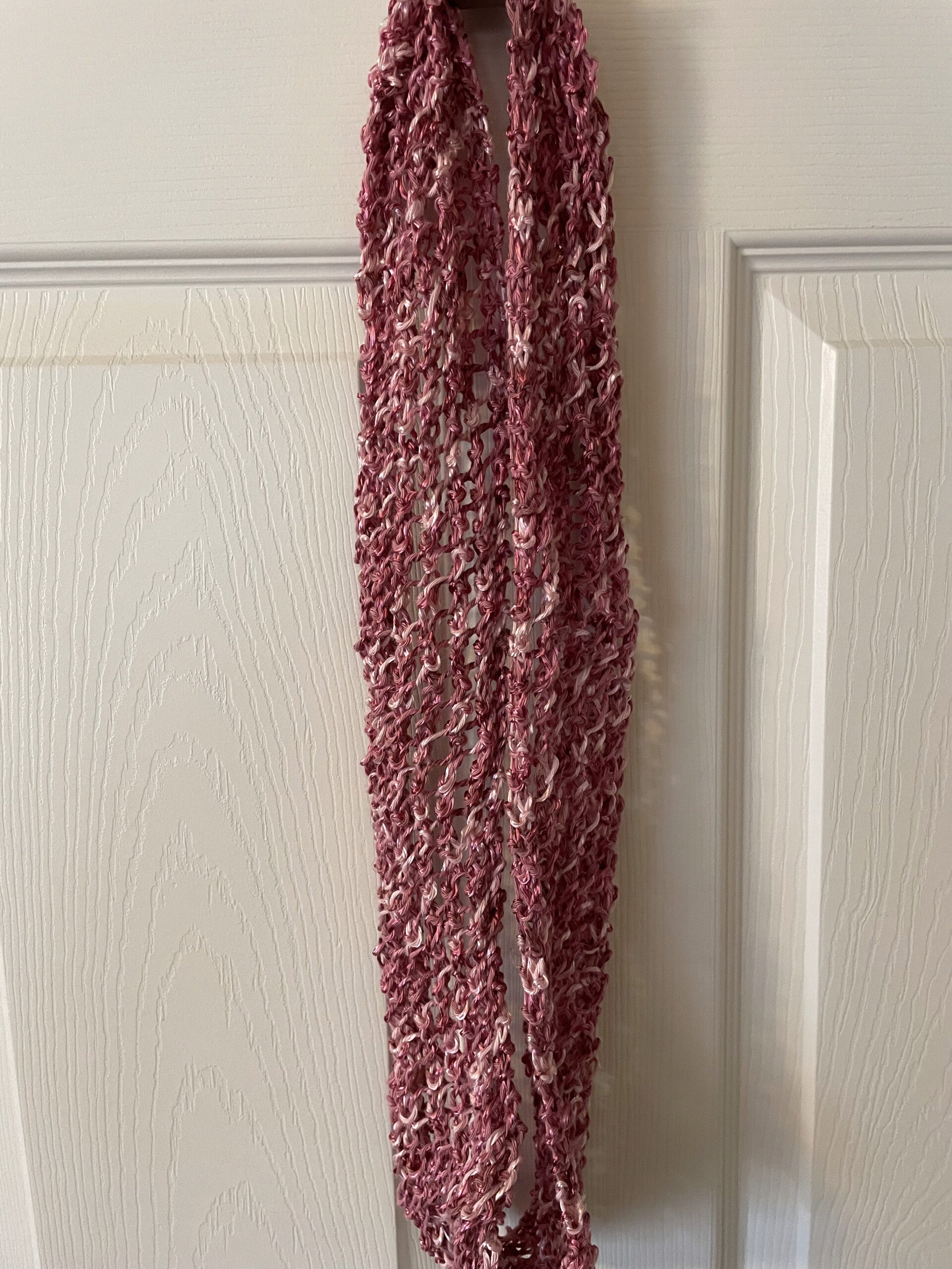 This is a light-weight infinity scarf that can be worn in the spring and summertime. It is 34 inches long and 4 inches wide. The yarn is stretchy and the color is rose pink. The knitting pattern looks like lattice which gives the scarf a lace look.