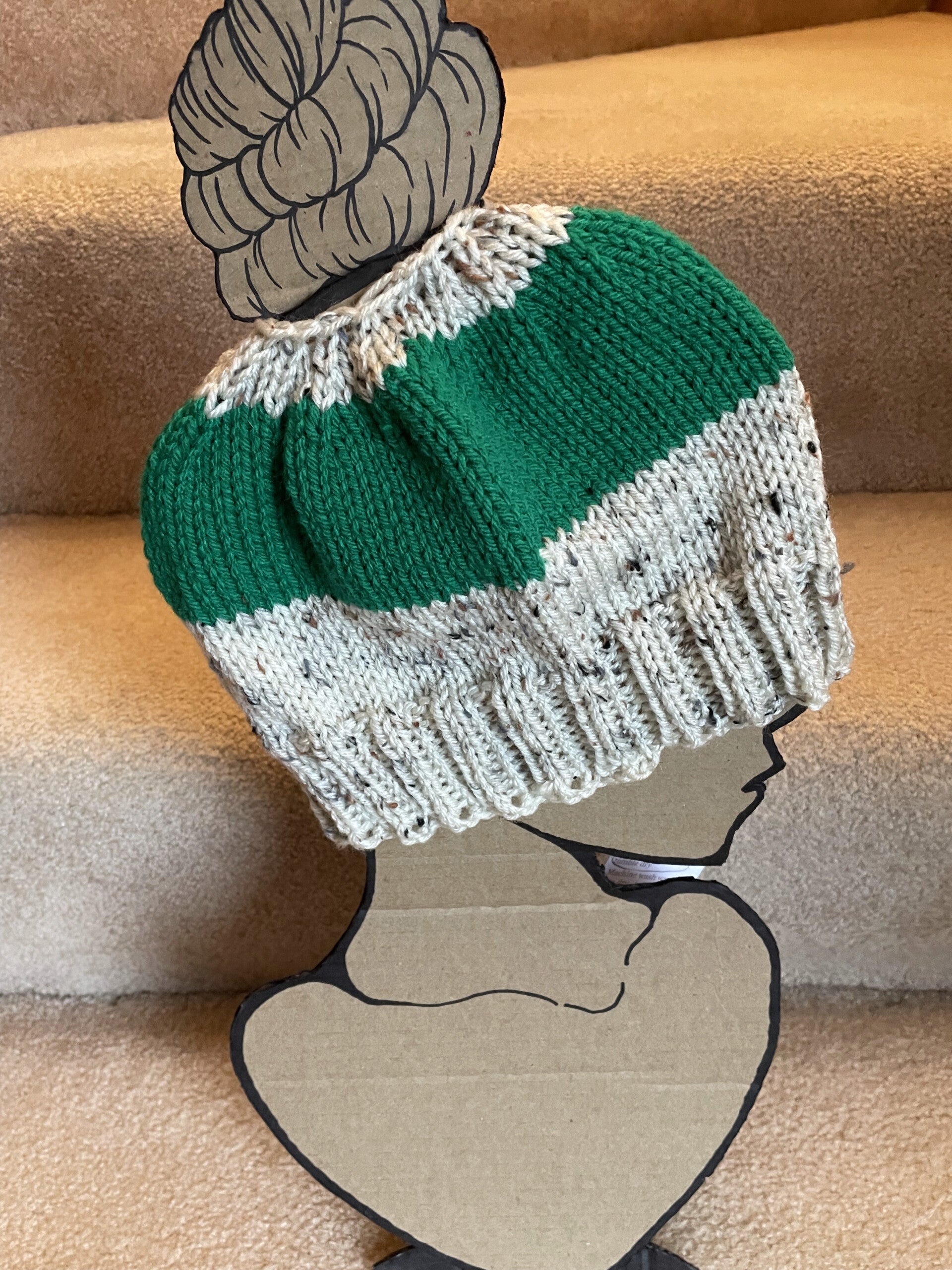 This is an adult size messy bun hat. This hat is extremely popular currently. The hat has a hole in the top to allow for a pony tail or bun. The height of the hat is seven inches and the circumference is 17 inches. The hat does stretch for larger heads. The hole at the top of the hat is 1.5 inches and will allow for a lot of hair to be pulled through. The fiber is 100% acrylic. Easy care of machine wash warm and tumble dry. The yarn color is oatmeal and green.