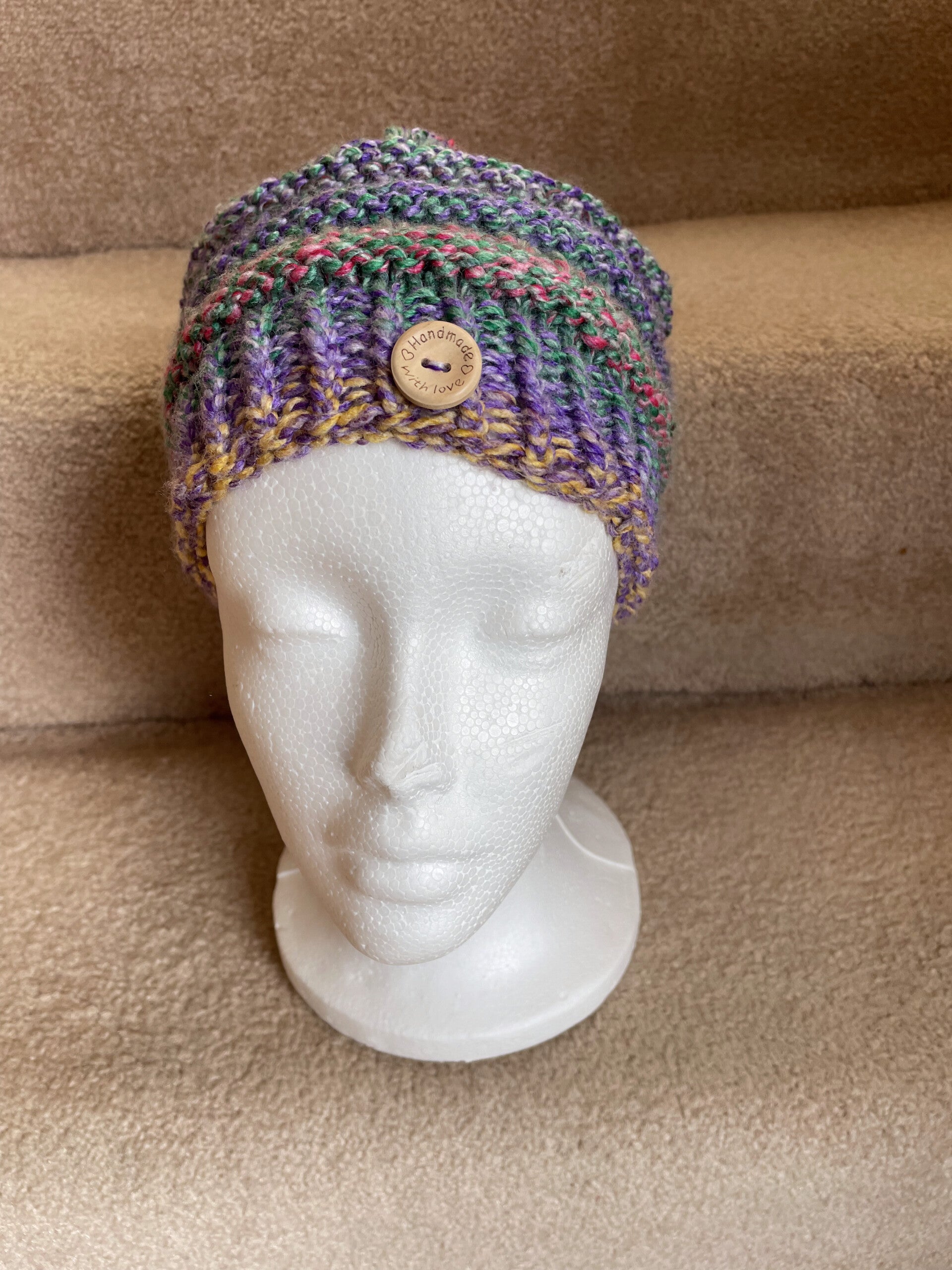 This is a CC style boulder beanie hat that is similar to the hats that are so popular right now. The yarn is 100% acrylic and is machine wash and dry. The yarn is variagated with purple, link, green and yellow. This hat would look nice with a taupe or gray coat. The circumference of the hat is 20 inches. It will fit an adult woman and will stretch to fit. The height of the hat is 8.5 inches. I added a button that says "Handmade with Love."