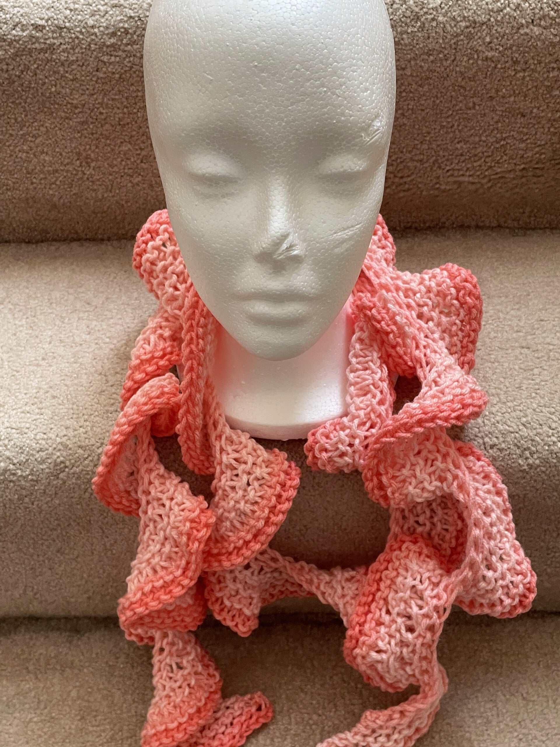 This is a spiral scarf in shades of coral. It is 74 inches long and 2.5 inches wide. The yarn fiber is 100% acrylic. Care is machine wash warm and tumble dry low. It is a long flowing feminine scarf. It will add color to any outfit.