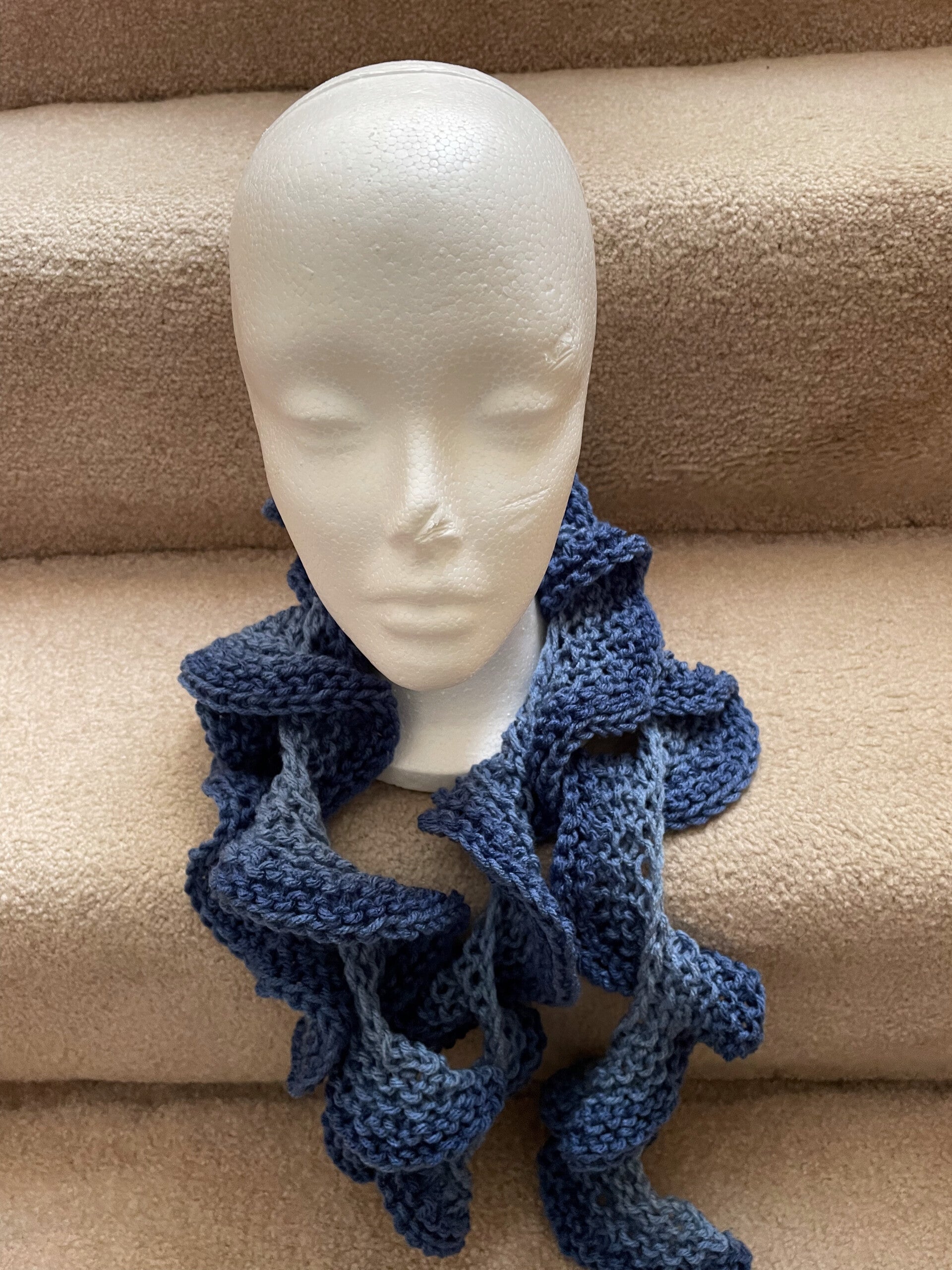 This is a spiral scarf in shades of cobalt blue.  It is 74 inches long and 2.5 inches wide.  The yarn fiber is 100% acrylic.  Care is machine wash warm and tumble dry low.  It is a long flowing feminine scarf.  It will add color to any outfit.