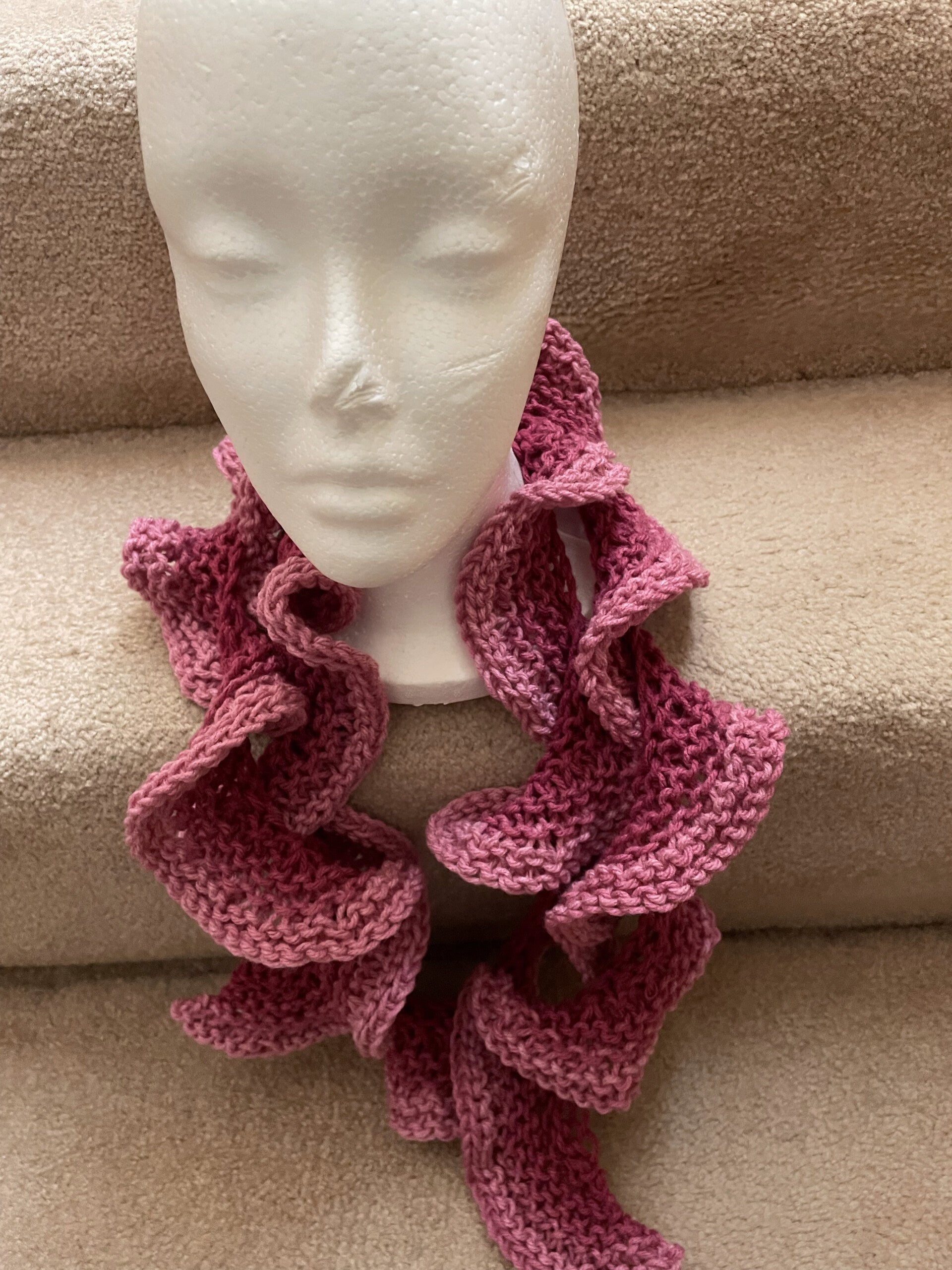This is a spiral scarf in shades of rose. It is 74 inches long and 2.5 inches wide. The yarn fiber is 100% acrylic. Care is machine wash warm and tumble dry low. It is a long flowing feminine scarf. It will add color to any outfit.