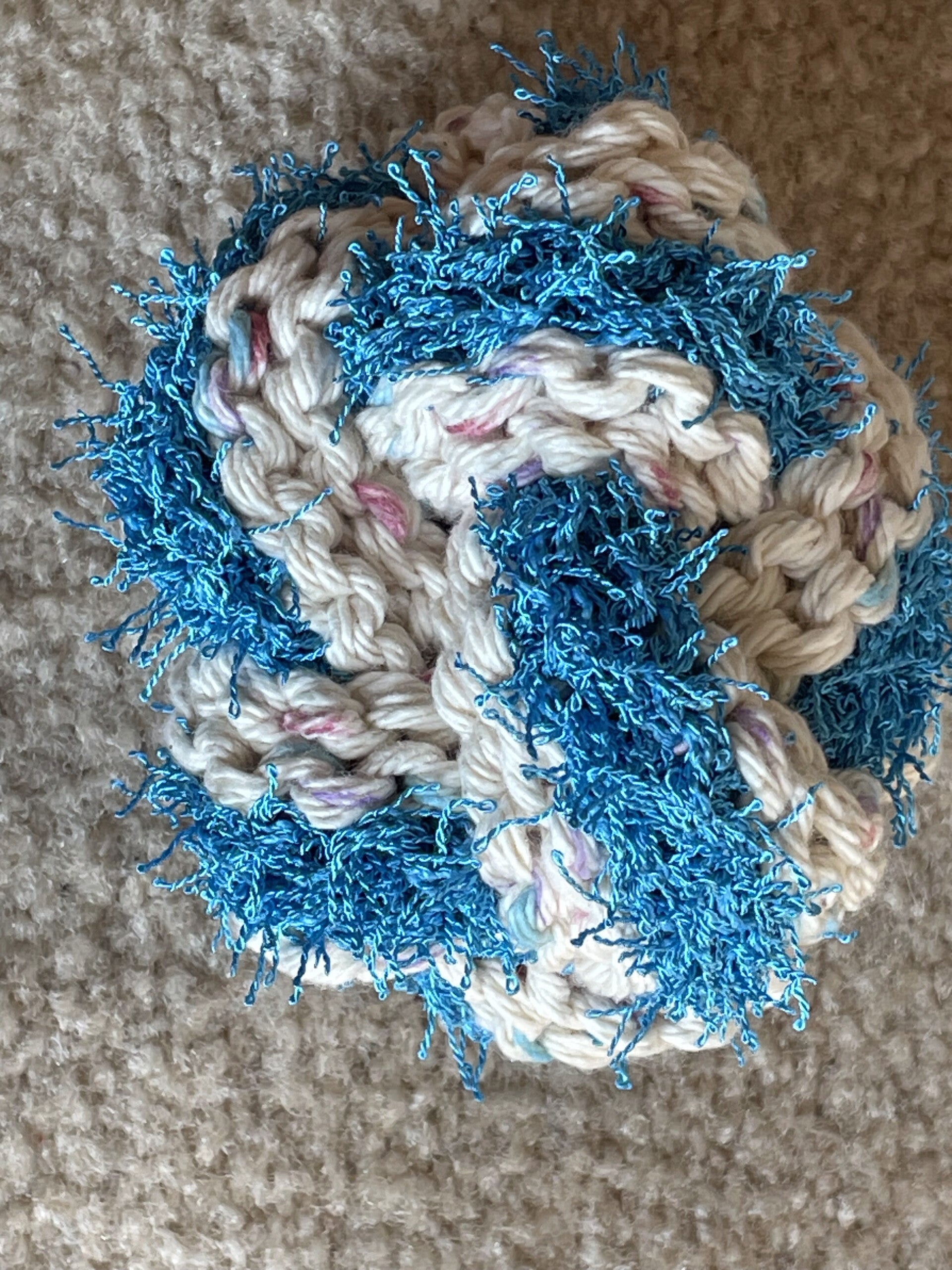 This scrubber is for use in the bath or shower. Just add bath or shower gel. This scrubber is designed to replace the disposable loofa that many people use. This item can be tossed into the washer and dryer rather than the trash can. This scrubber is also good to clean your shower. This scrubber is three inches wide and the circumference is 9.5 inches. It is a Chinese Knot.