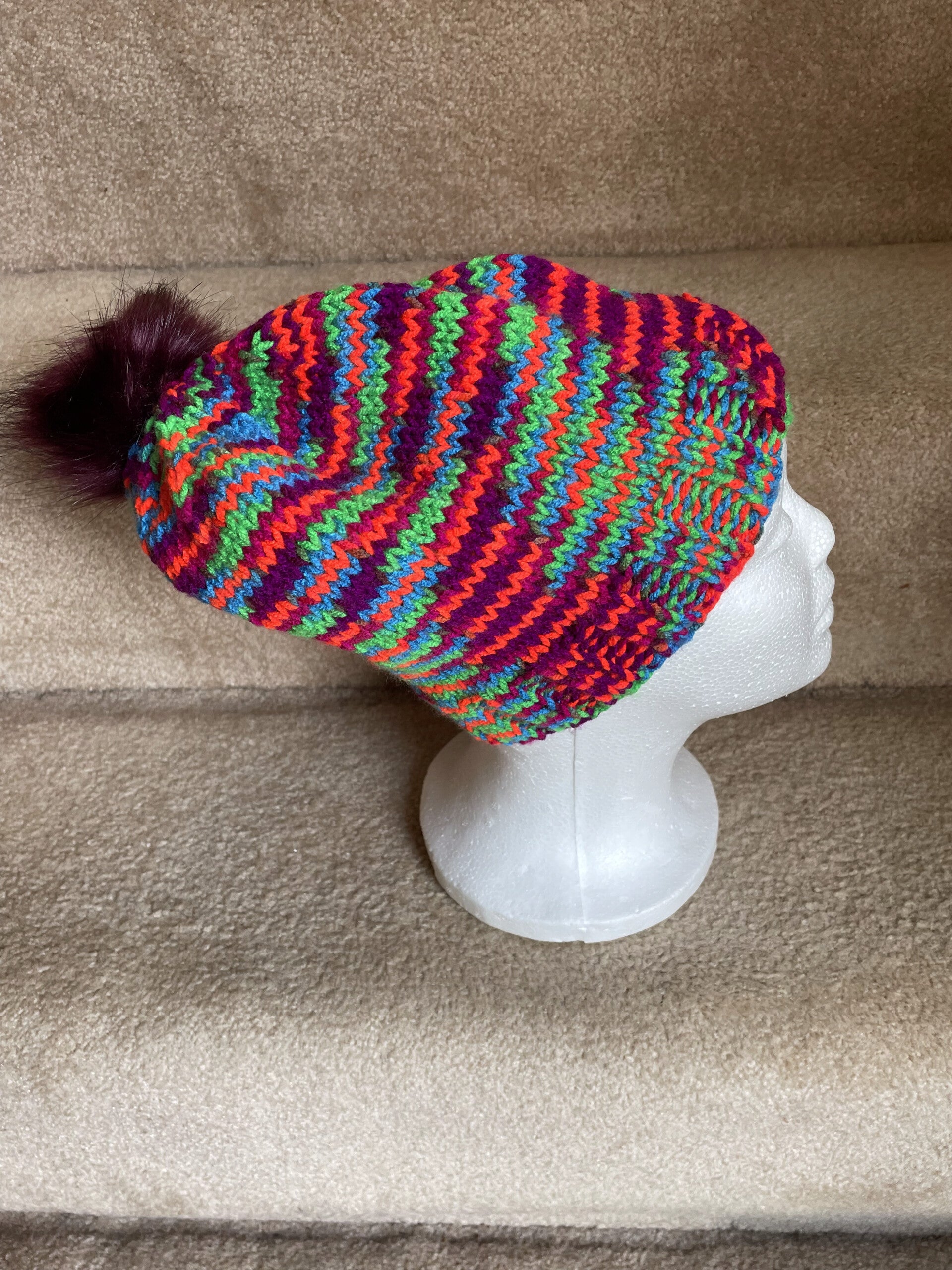 This is a winter hat sized for an elementary aged child. The circumfernce is 16 inches and the height is 9 inches. The brim is 2 inches and may be cuffed if necessary. There is a burgandy pompom sewn at the top. The yarn fiber is acrylic. Care instructions are machine wash warm and tumble dry low. The pompom may be washed and dried in the machine.