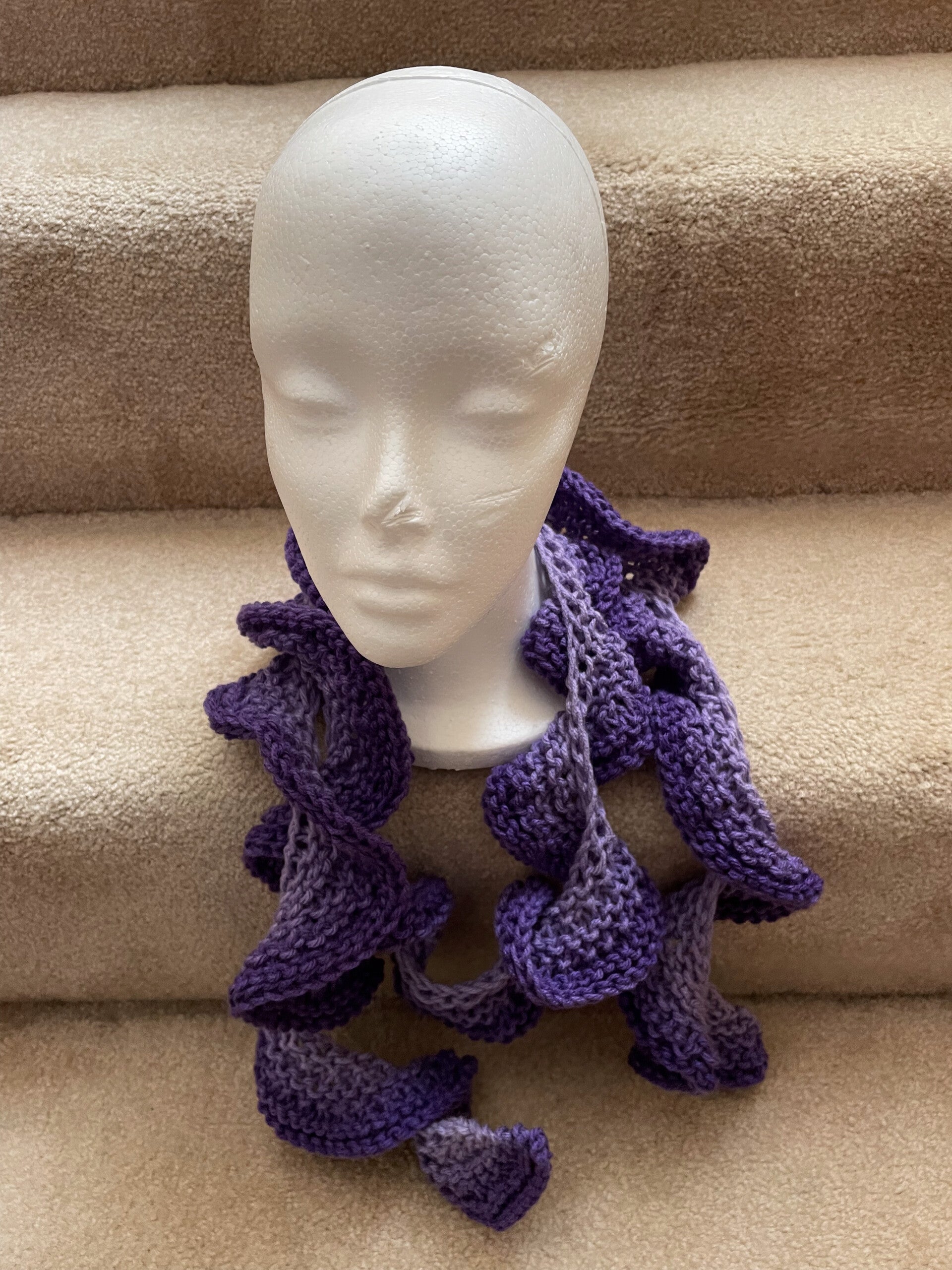 This is a spiral scarf in shades of purple. It is 74 inches long and 2.5 inches wide. The yarn fiber is 100% acrylic. Care is machine wash warm and tumble dry low. It is a long flowing feminine scarf. It will add color to any outfit.