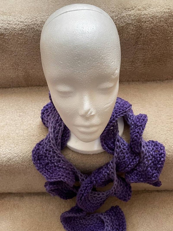 This is a spiral scarf in shades of purple.  It is 74 inches long and 2.5 inches wide.  The yarn fiber is 100% acrylic.  Care is machine wash warm and tumble dry low.  It is a long flowing feminine scarf.  It will add color to any outfit.