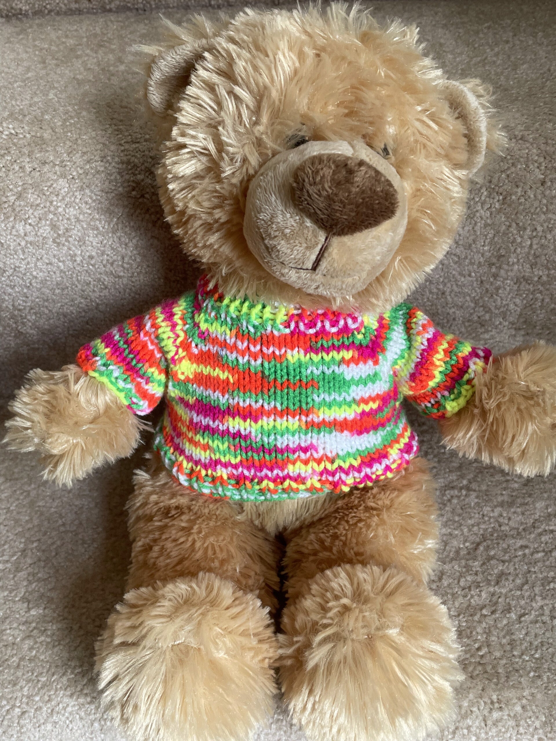 This is a small sweater sized to fit a teddy bear. This item does not include the teddy bear; it is the sweater only. I took a picture of the sweater on the bear so that you can see what it looks like on a bear. This sweater will fit a "Build a Bear" size. The yarn is neon colors and white. The yarn is 100% acrylic and is machine wash warm, tumble dry low.