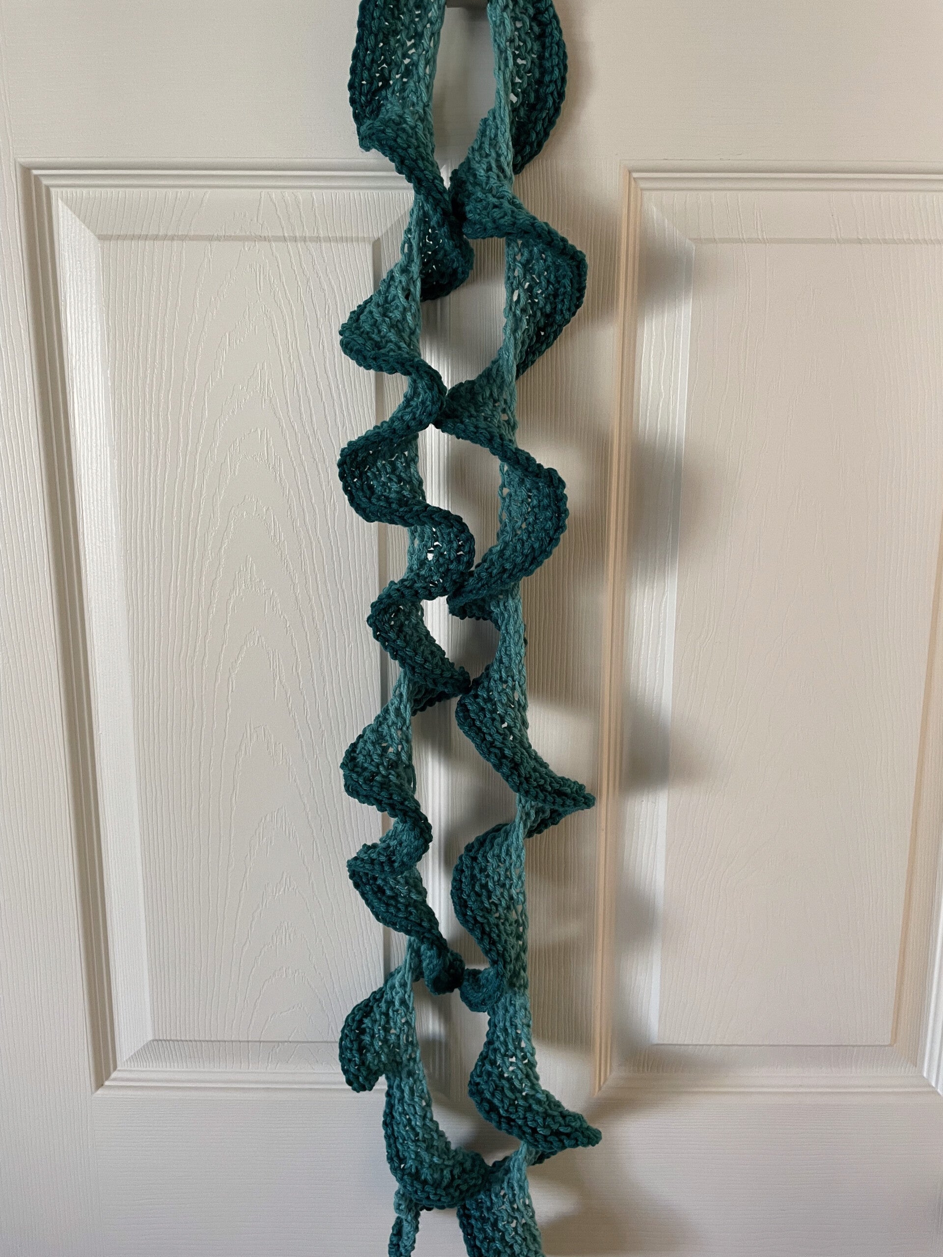 This is a spiral scarf in shades of teal. It is 74 inches long and 2.5 inches wide. The yarn fiber is 100% acrylic. Care is machine wash warm and tumble dry low. It is a long flowing feminine scarf. It will add color to any outfit.