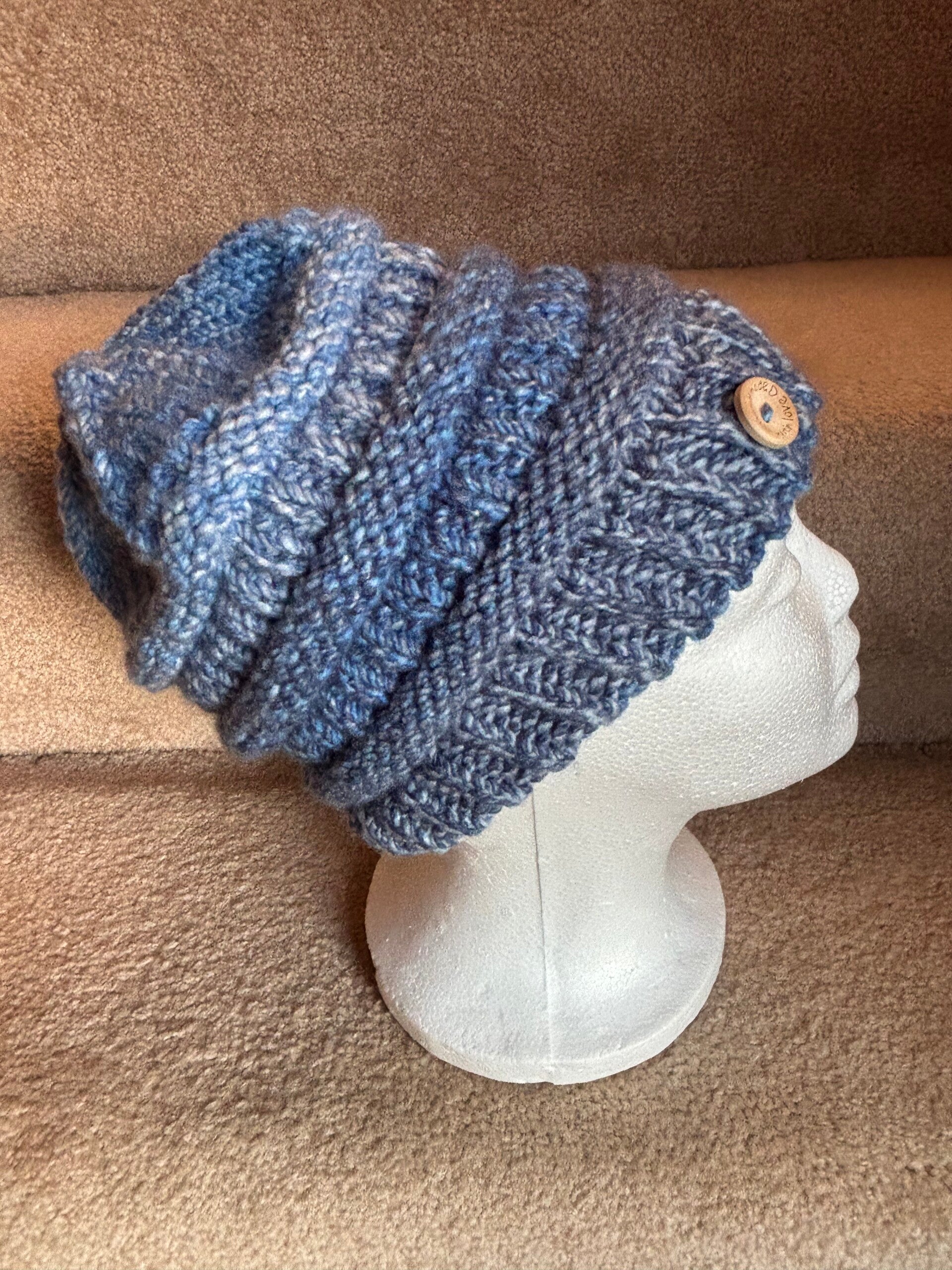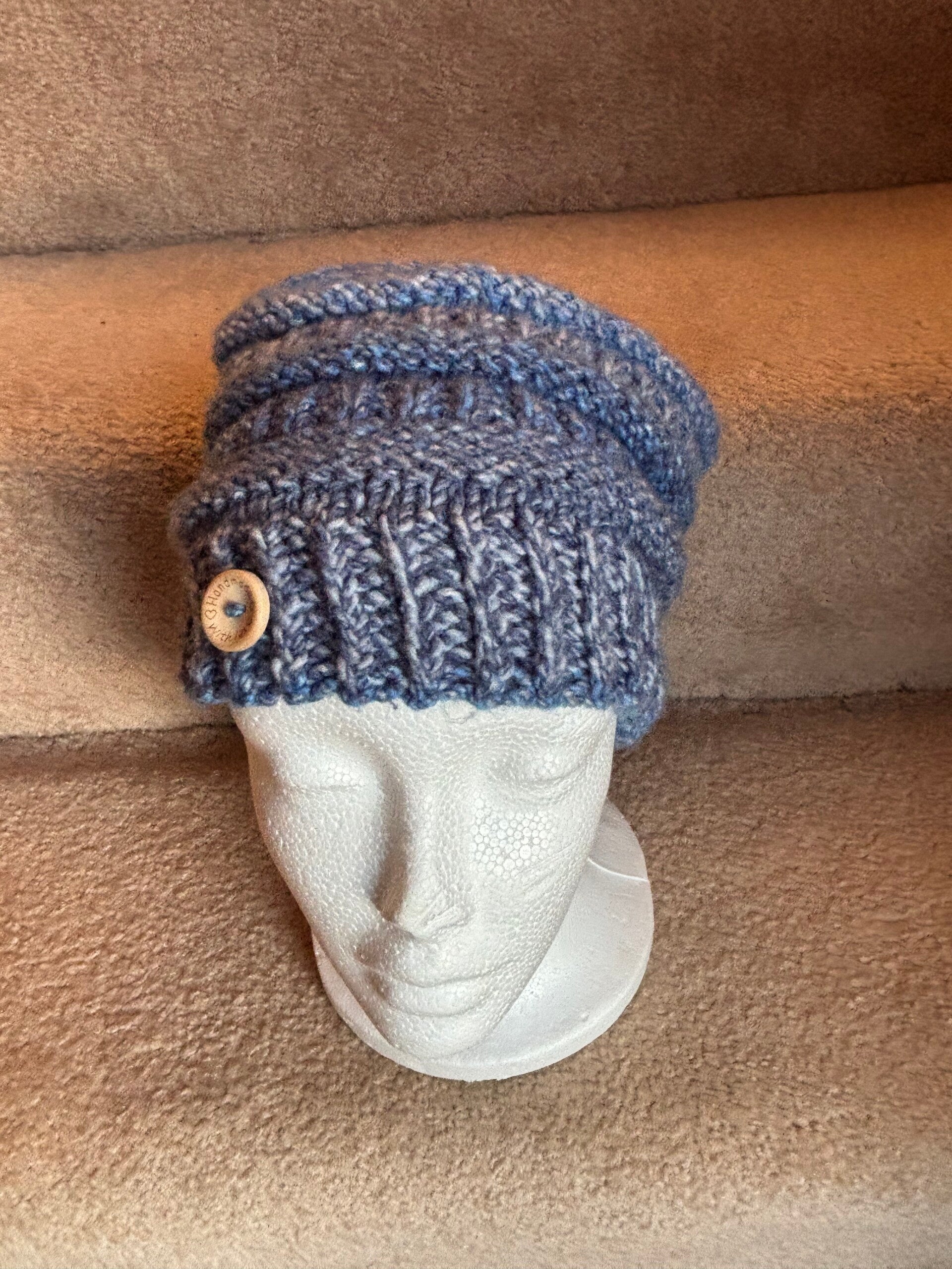 This is a CC style boulder beanie hat that is similar to the hats that are so popular right now. The yarn is 100% acrylic and is machine wash and dry. The yarn is variagated with shades of country blue and cream. This hat would look nice with a navy or gray coat. The circumference of the hat is 20 inches. It will fit an adult woman and will stretch to fit. The height of the hat is 8.5 inches. I added a button that says "Handmade with Love."