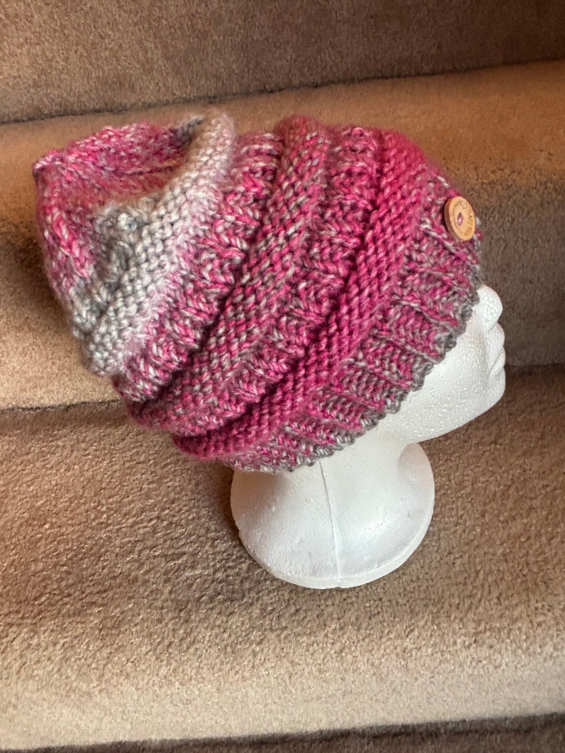 This is a CC style boulder beanie hat that is similar to the hats that are so popular right now. The yarn is 100% acrylic and is machine wash and dry. The yarn is variagated with pink and gray. This hat would look nice with a black or gray coat. The circumference of the hat is 20 inches. It will fit an adult woman and will stretch to fit. The height of the hat is 8.5 inches. I added a button that says "Handmade with Love."
